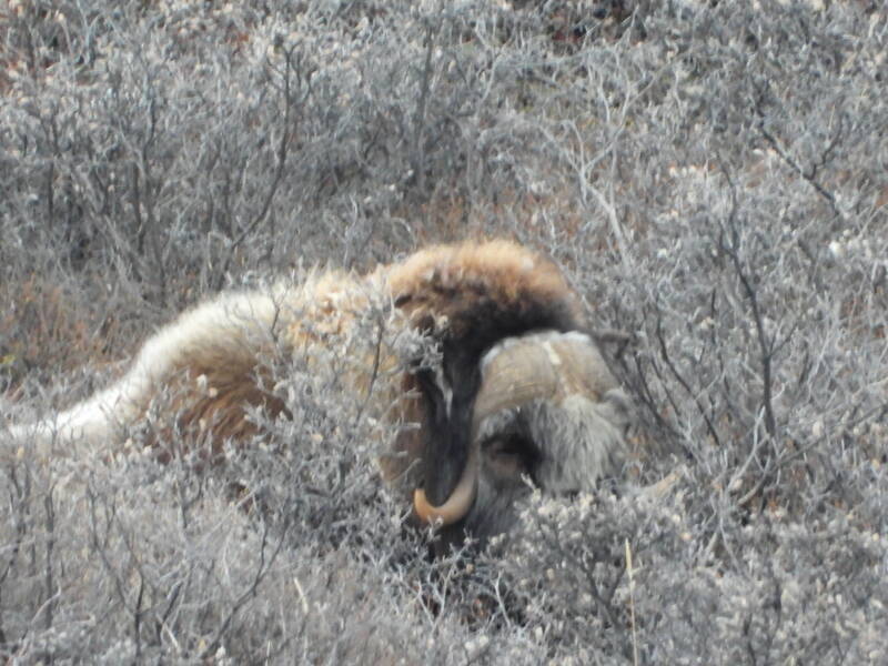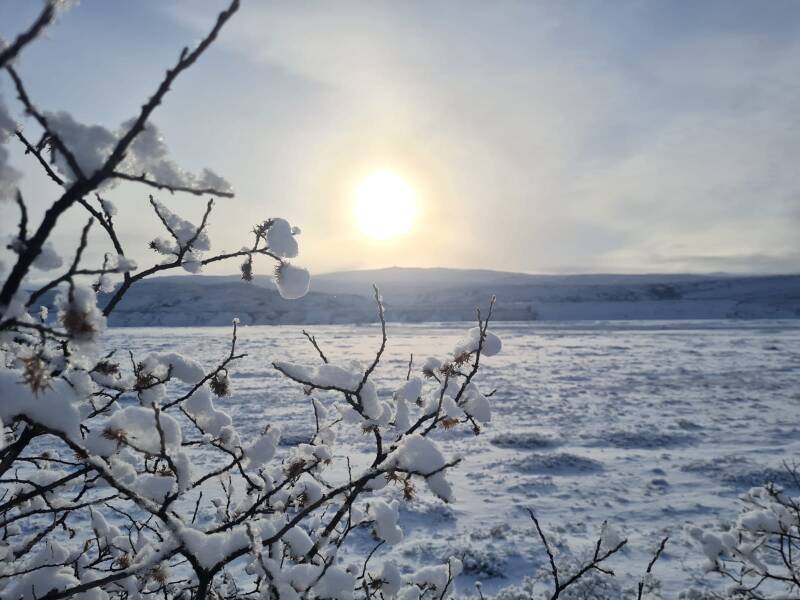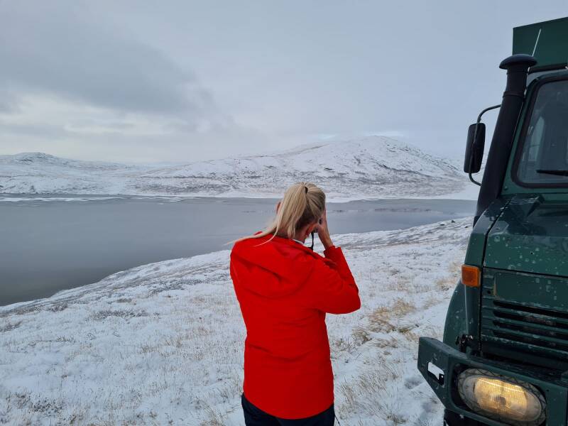 Rond 07.00 uur vertrekken we met de auto naar de start. Het is nog even een uitdaging, want het is enorm glad. Onderweg zien we een paar sneeuwhazen, rendieren, musk oxen en een vos. De kou is gewoon te zien aan het uitzicht. Als ik even uit de auto stap, voel ik dat mijn voeten zo ontzettend koud zijn. Mijn hardloop schoenen zijn niet gemaakt voor deze kou.