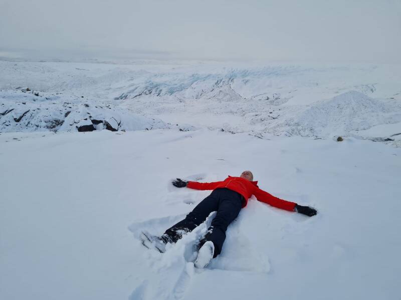 Ik blijf door lopen en zo nu en dan moet ik echt oppassen dat ik niet val. Het parcours blijft glooiend en het uitzicht op Russel Glacier is adembenemend. Net na kilometer negen is er een forse afdaling en met deze forse afdaling is ook een flink pak ijs op het wegdek. Ik wil het ontwijken, maar het is te laat. Als een glas wat je over de tafel schuift, glijden mijn voeten alle kanten op naar beneden. Ik voel me als bambie op het ijs. Mijn hart zit in mijn keel en ik heb moeite om te blijven staan. Ik wil zachter gaan, maar door de steile afdaling ram ik met een flink tempo naar beneden. Ik heb het niet meer. Uiteindelijk kom ik op een vlakker stuk en nadat mijn heupen, benen, armen en enkels ongeveer alle kanten zijn opgeklapt kom ik veilig tot stilstand. Pfieuw dit had zo fout af kunnen lopen. Ik moet echt even op adem komen. Hoe een belevenis van een paar seconden een eeuwigheid kan duren, waarvan de uitkomst als een 50/50 aan voelt.