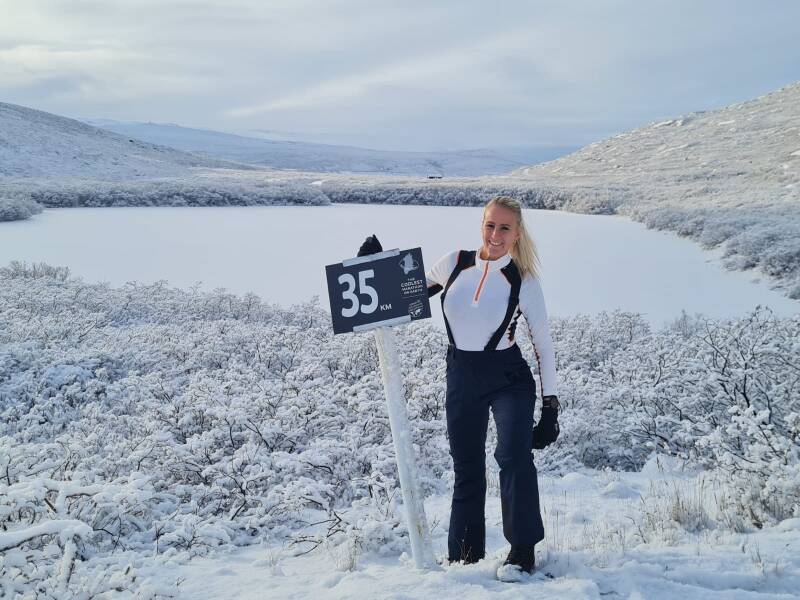 Vanaf nu is het parcours een feest der herkenning, want gisteren tijdens de halve marathon liep ik over precies hetzelfde gedeelte van het parcours. Er is geen sneeuw meer op het gedeelte waar ik loop, maar nog wel veel stukken ijs. De focus moet dus blijven. Ik geniet van de kou en het zonnetje. De kilometers vliegen voorbij en na alle heuveltjes ben ik al aangekomen op kilometer dertig. Ik neem iets te drinken en loop dan weer door.