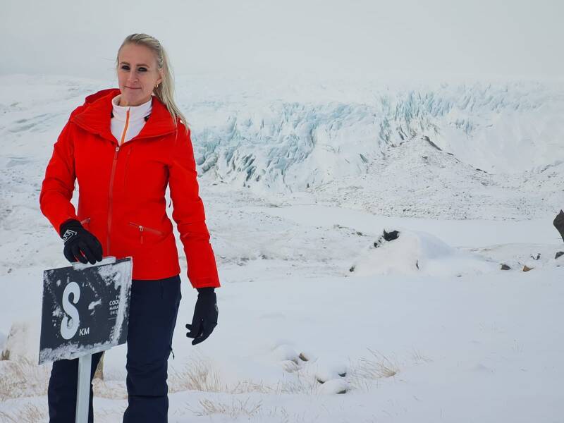 Bijna drie kilometer gaat het parcours op en af. Het is meteen een uitdaging, want het lopen op spikes in combinatie met het glooiende parcours gooit mijn hartslag omhoog. Op sommige stukken ren ik werkelijk over een laag ijs, maar met de spikes is dat prima te doen. Ik passeer point 66 met een prachtig uitzicht op de Russel Glacier. Nog even een enorm glad stuk en dan is de klim over de smalle paadjes over de Morraine voordat ik de ijskap op loop. Het uitzicht is geweldig. Ergens vind ik het een beetje spannend, want zelfs met de spikes glij je nog alle kanten op over de ijskap. Ik moet de focus houden, want het volgen van de paaltjes is cruciaal om de ijskap veilig over te lopen. Onder mij hoor ik het ijs soms zo hard kraken dat ik er van schrik.