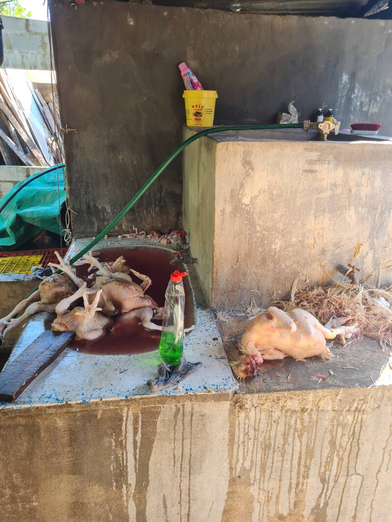 Aangekomen in het dorp, krijg ik te zien hoe ze kippen slachten, plukken en schoonmaken. Het is hier de normaalste zaak van de wereld. Ook krijg ik een maandje met schildpadden te zien. Deze worden uit de rivier gehaald. Ze worden gegeten. Tot mijn verbazing word er slechts een klein stuk ter grootte van een 2 euro munt uit de schildpad gehaald om op te eten.