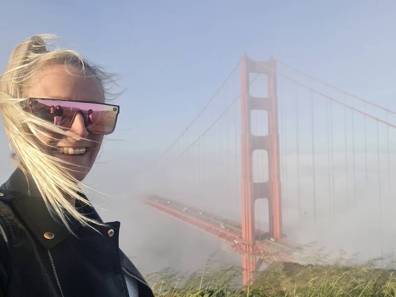 Nu mijn honger gestild is kan de urenlange rit naar San Francisco beginnen! De rit is lang, maar ik kijk er ook naar uit. Om 18.15 uur zijn we eindelijk op het uitzichtpunt om foto's te maken van de golden bridge. Deze is overigens compleet bedolven onder de wolken. Het heeft ook wel weer iets. De wind is gigantisch, maar ach ik heb de brug gezien en deze is indrukwekkend.
