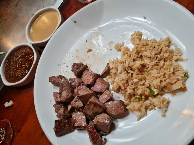Even opfrissen en dan zo vanuit het hotel binnen lopen bij het Japanse restaurant Benihana. Na een korte wachttijd kunnen we plaats nemen voor een 6 gangen diner met zes andere onbekenden. Het eten is heel erg goed. Leuke sfeer, leuke mensen en een goede service.