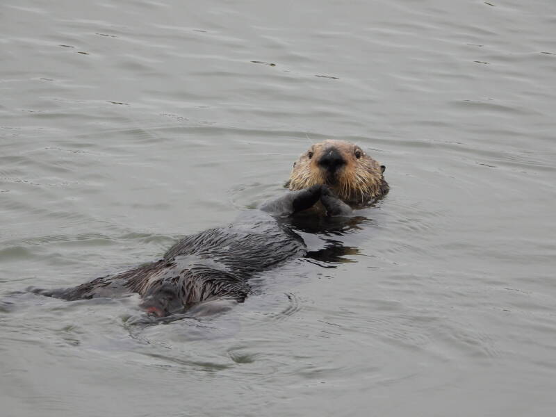. Ik ben een dierenvriend, een liefhebber van de natuur. Ik weet dat de kans niet groot is, maar op deze plek zouden zee otters kunnen zijn. De auto staat nog niet stil en ik zie een zee otter! Wat gaaf!! Ik ben wild van geluk. Het is 18.00 uur en het is grijs en grauw weer, dit maakt het fotograferen erg lastig. Één uur lang fotografeer ik drie zee otters. Ze zijn grappig. Druk qua beweging, maar aandoenlijk om te zien.