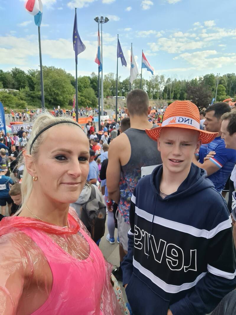 Ik krijg de medaille om gehangen, maar het mooiste is dat mijn zoon als verrassing naar de finish is gekomen. Ik word er emotioneel van.