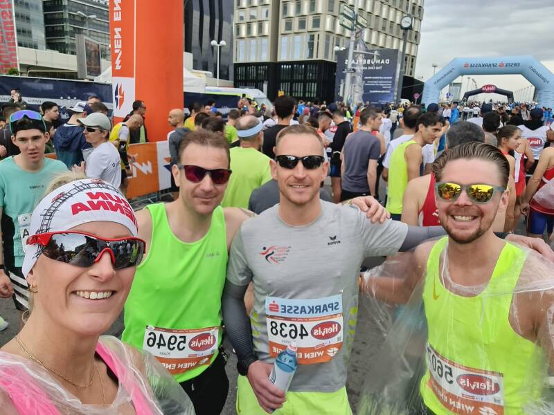 Om 18.15 uur loop ik naar de Metro U1, om gezamenlijk met mijn loopmaatjes en supporters naar het startgebied af te reizen. De metro zit ram en ram vol! We kunnen ons nog net tussen de menigte in de metro drukken, gelukkig zijn het maar twee stops. Vrij snel zijn we al in het stargebied. Ik wil eigenlijk nog wel even plassen maar dixies zijn er vrijwel niet. Ach ja, dan de wave1 maar in! Samen loopmaatjes met Klaas, Levi en Tommy tellen we af. Ook ontmoet ik hardloper Gijs in het startvak, hij herkende mij van Facebook!